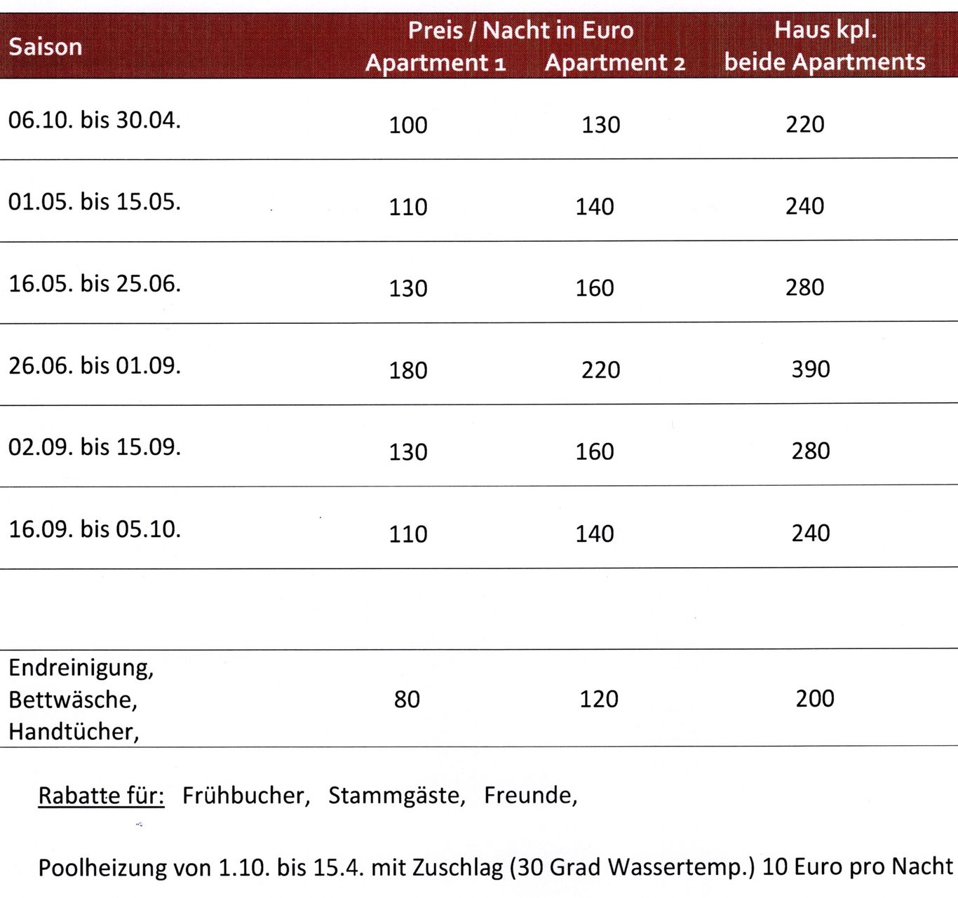 Preise verstehen sich pro Übernachtung für ein Apartment (Haus kpl. beide Preise zusammen)