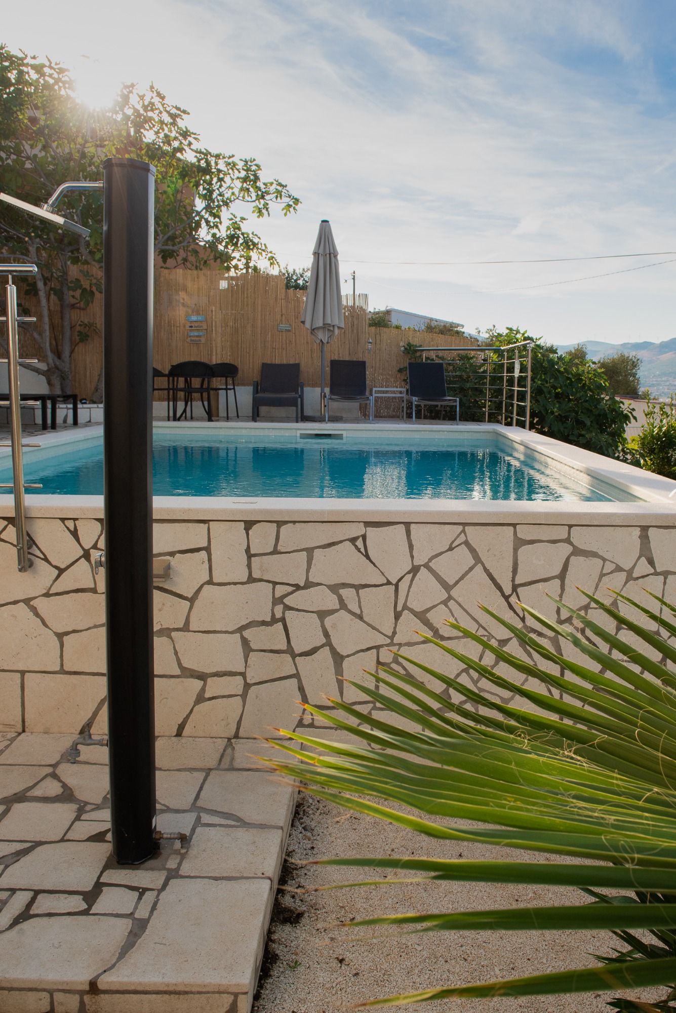 Natürlich können Sie auch direkt unterhalb Ihrer Villa ins Meer zum Baden gehen, ein schöner Kiesstrand (für Kinder geeignet) ist die ruhige Anwohnerstraße runter ca. 150m entfernt. Hier ist auch eine Cafe-Bar, Eis usw.